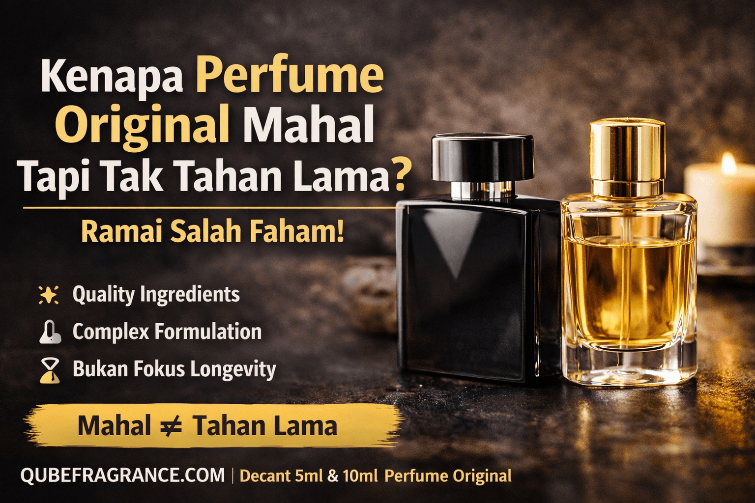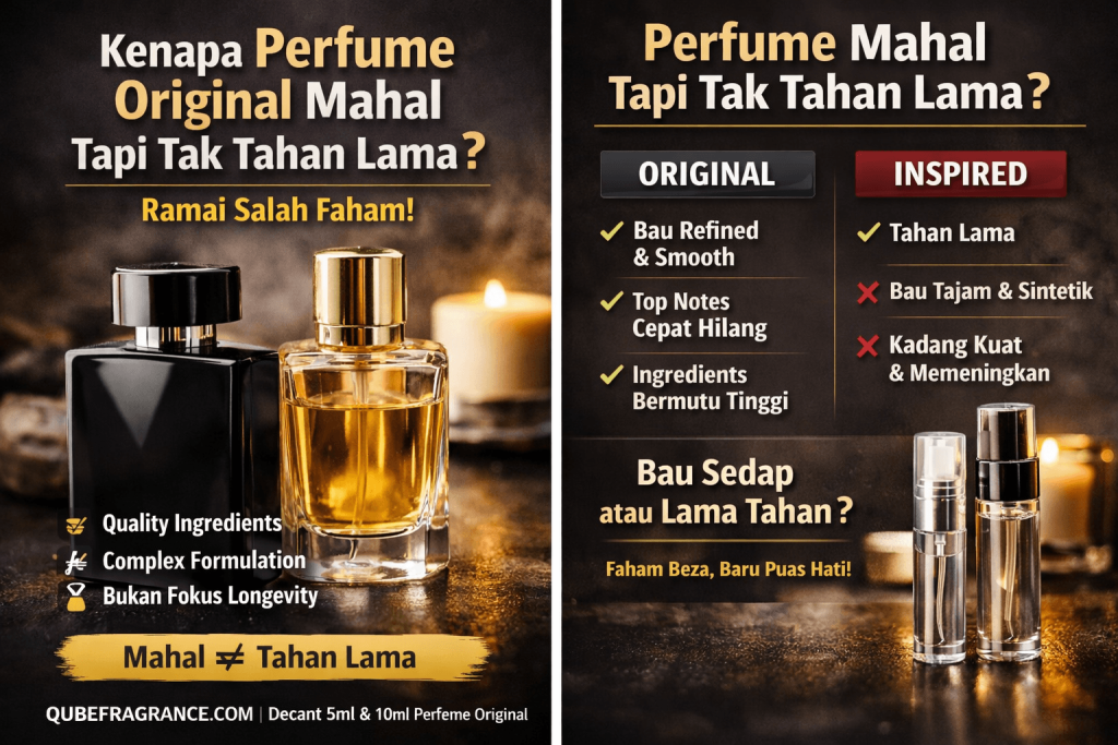 Perfume original mahal bukan sebab nak bagi tahan lama 12 jam. Dia mahal sebab quality ingredients, complex formulation, dan experience bila pakai. Kalau target utama nak tahan lama, pilih concentration tinggi macam EDP atau Extrait. Kalau nak bau premium & smooth, itu memang kelebihan perfume original.