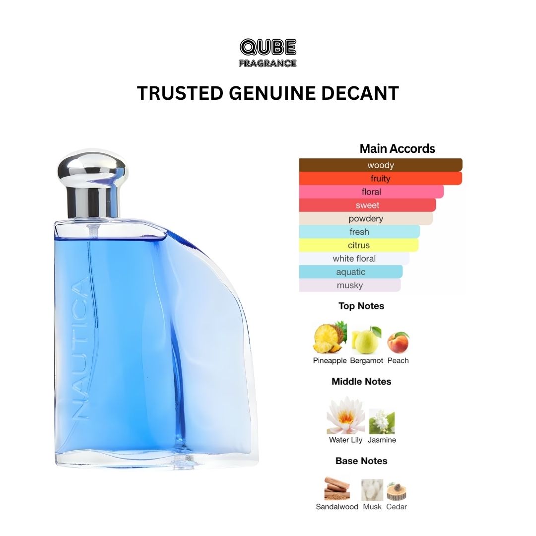 Nautica Blue by Nautica is a Aromatic Aquatic fragrance for men. Nautica Blue was launched in 2005. The nose behind this fragrance is Maurice Roucel. Top notes are Pineapple, Bergamot and Peach; middle notes are Water Lily and Jasmine; base notes are Sandalwood, Musk and Cedar.