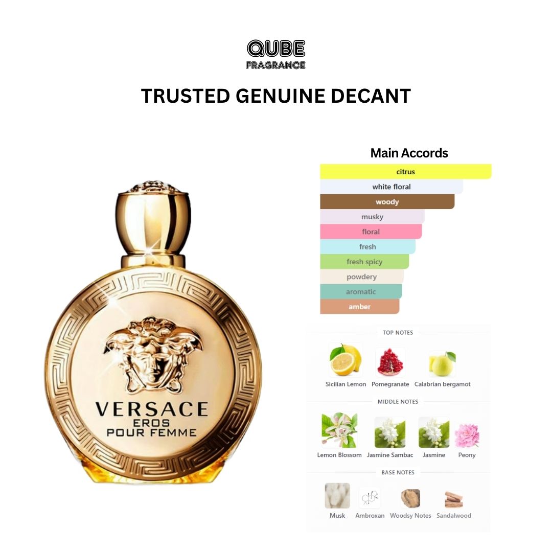 Eros Pour Femme by Versace is a Floral Woody Musk fragrance for women. Eros Pour Femme was launched in 2014. Eros Pour Femme was created by Alberto Morillas, Olivier Cresp and Nathalie Lorson. Top notes are Sicilian Lemon, Pomegranate and Calabrian bergamot; middle notes are Lemon Blossom, Jasmine Sambac, Jasmine and Peony; base notes are Musk, Ambroxan, Woodsy Notes and Sandalwood.